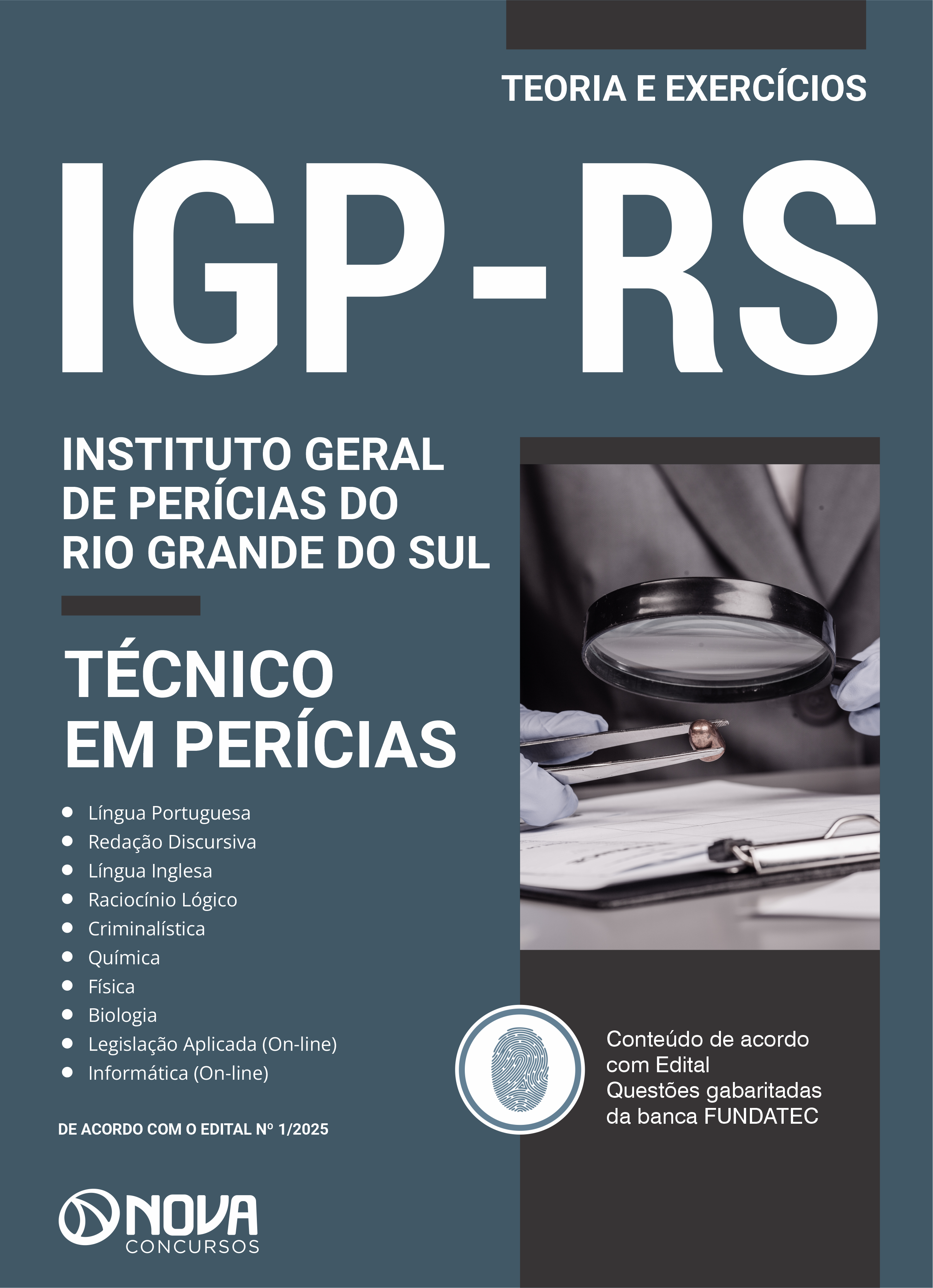 Conquiste sua vaga com a apostila IGP-RS 2025 - Técnico em Perícias! A Nova Concursos está com você nessa jornada!