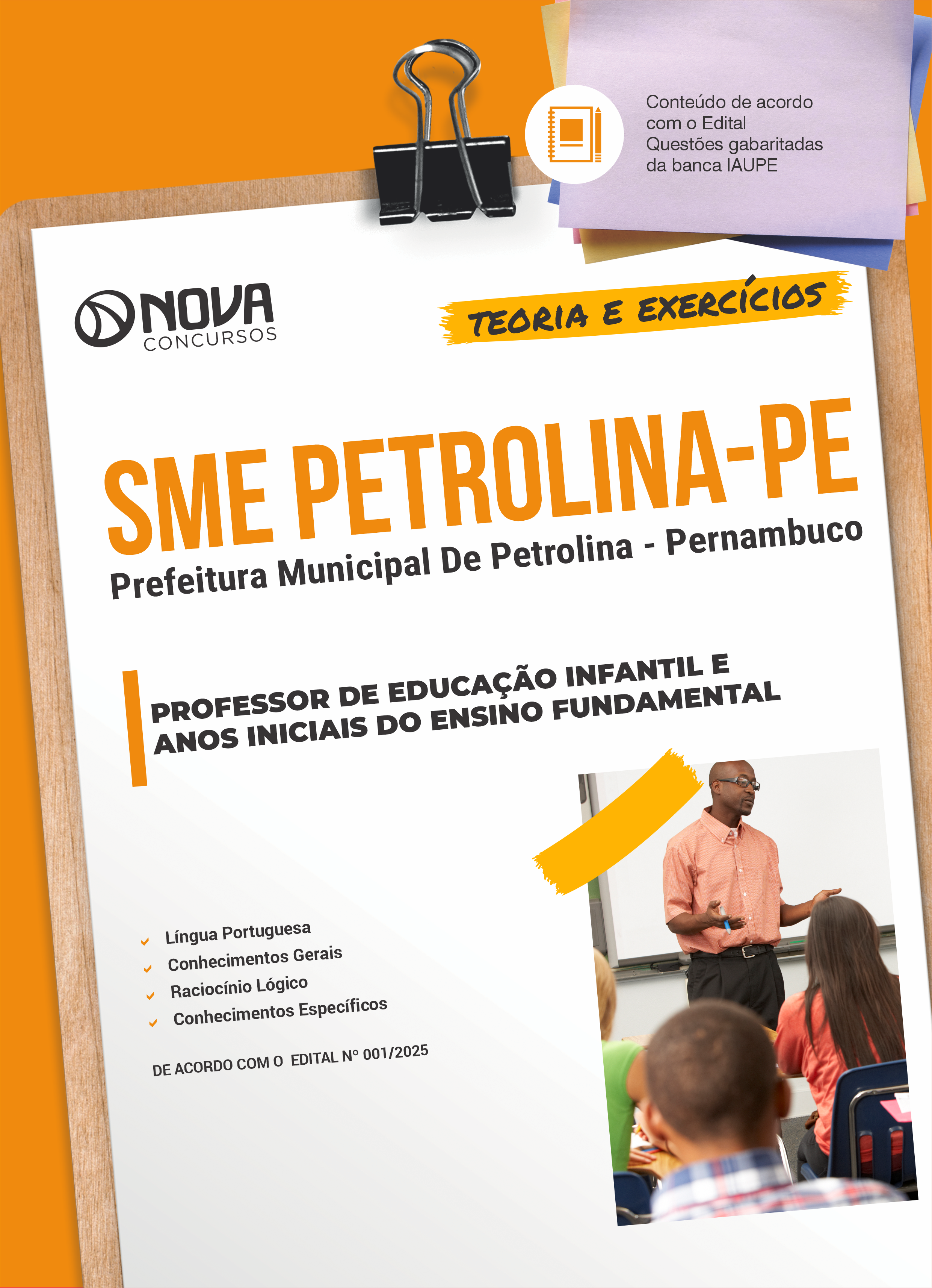 Invista em sua preparação e aumente suas chances de alcançar a sua aprovação com a apostila Prefeitura Municipal de Petrolina - PE - Professor de Educação Infantil e Anos Iniciais do Ensino Fundamental.