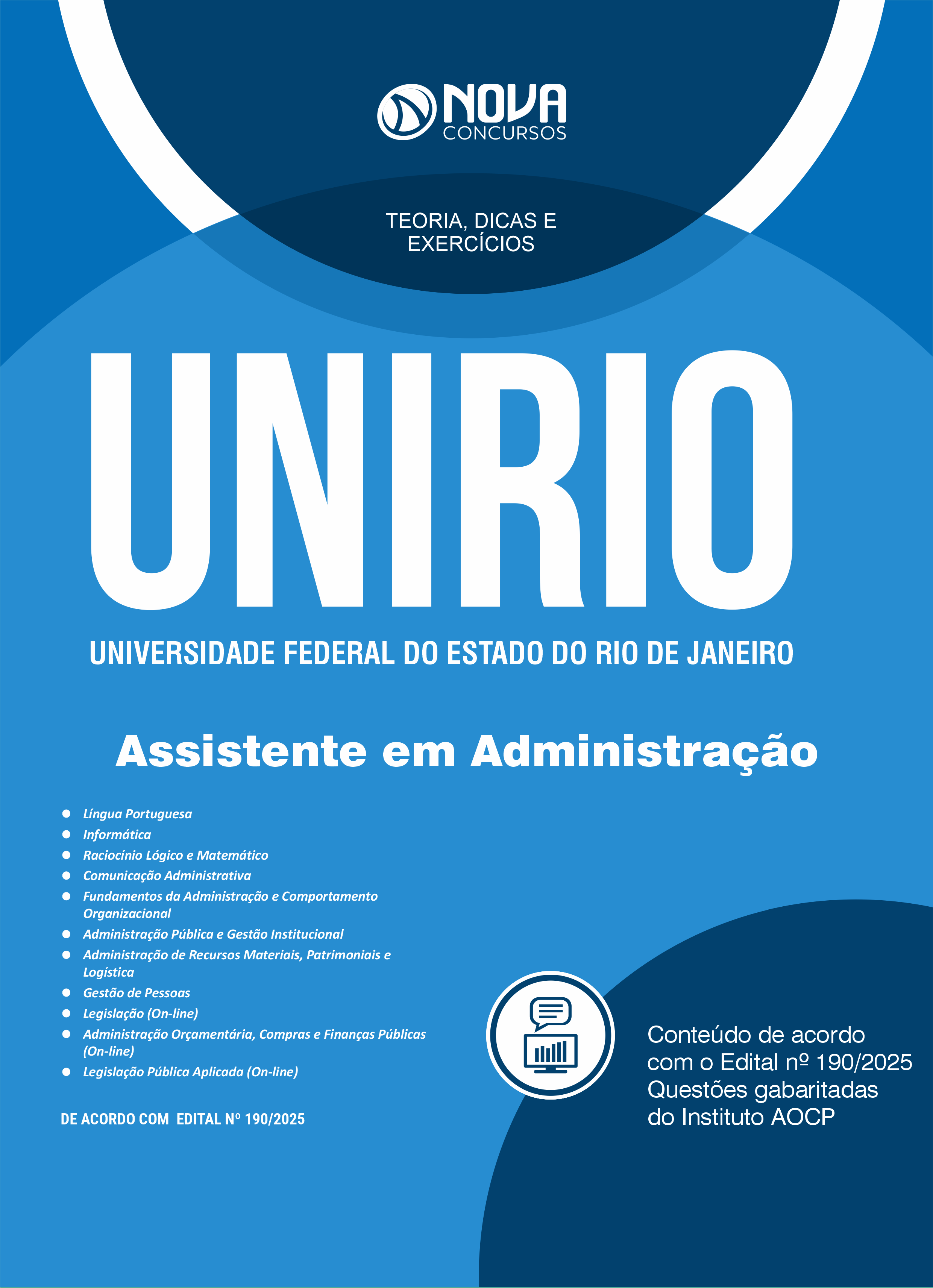Invista em sua preparação e aumente suas chances de alcançar a sua aprovação com a apostila Universidade Federal do Estado do Rio de Janeiro - UNIRIO - Assistente em Administração.