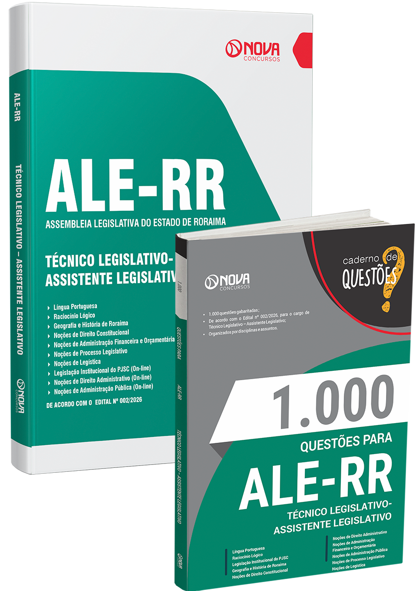 - Apostila ALE-RR 2026 - Técnico Legislativo - Assistente Legislativo: 100% atualizada e totalmente otimizada para agilizar seus estudos, de acordo com o último Edital. O material foi elaborado por nosso time de professores especialistas em concursos e organizado para proporcionar uma fácil assimilação do conteúdo.