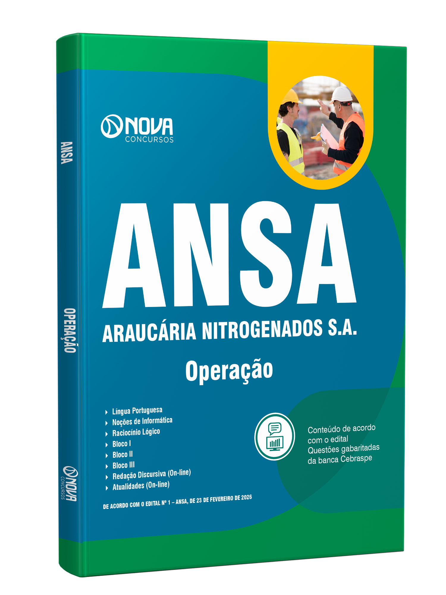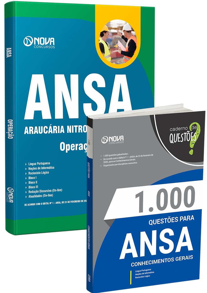 - Livro 1000 Questões Gabaritadas para ANSA - Conhecimentos Gerais: inclui questões de concursos recentes da banca organizadora responsável pelo certame do concurso ANSA - Araucária Nitrogenados S.A., selecionadas de acordo com os principais assuntos (conhecimentos gerais) cobrados no edital.