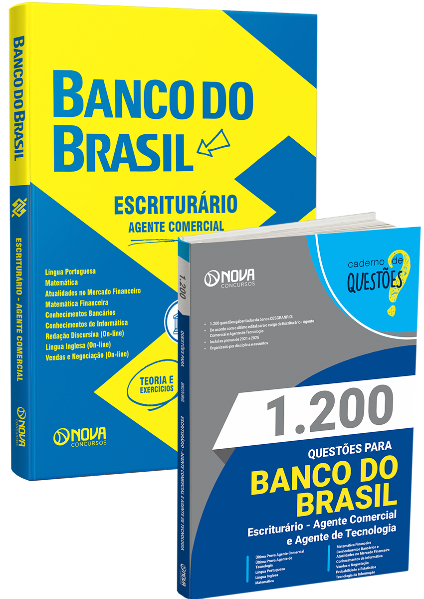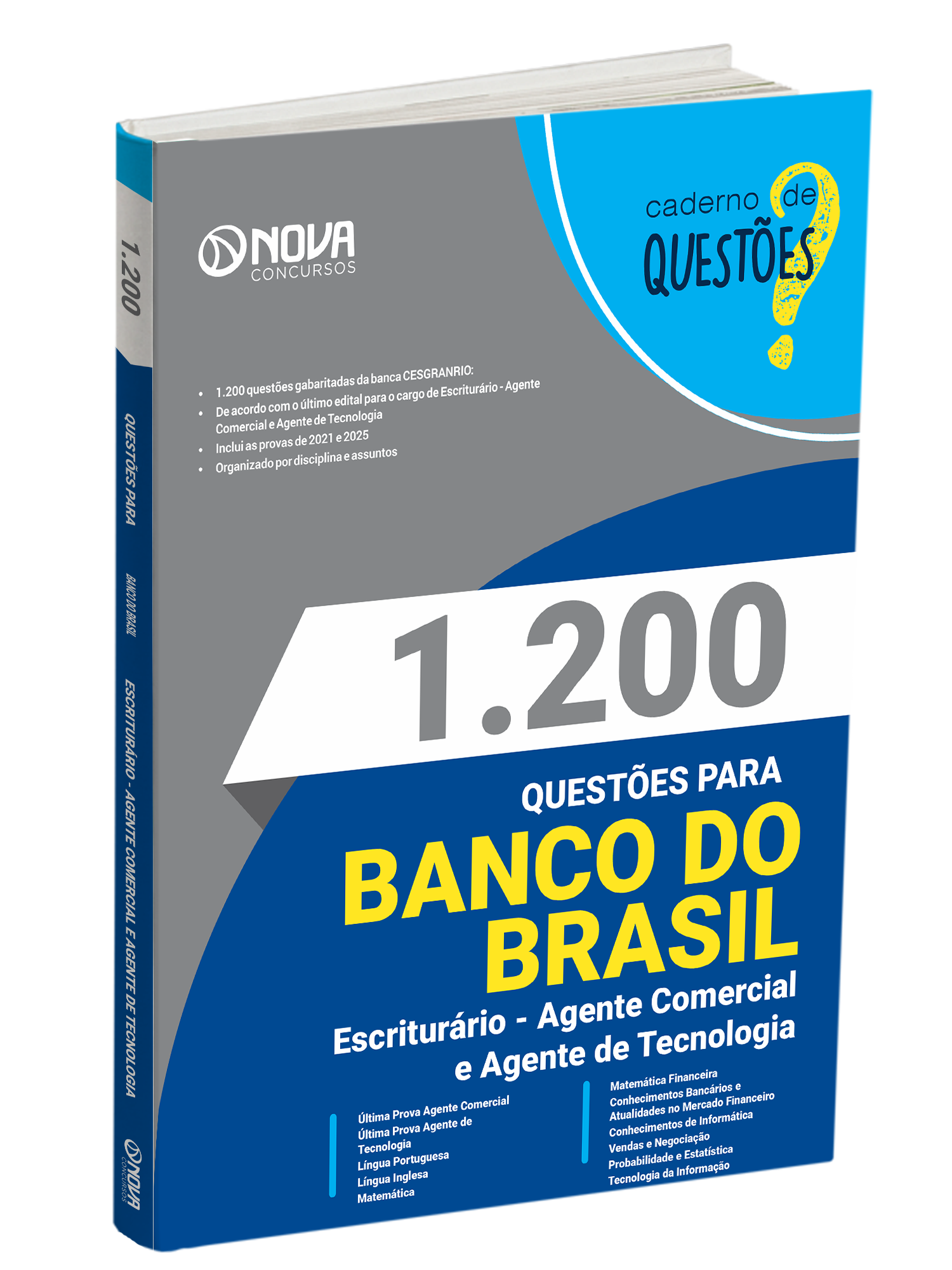 - Livro 1.200 Questões Gabaritadas para o Banco do Brasil 2026 - Escriturário - Agente Comercial e Agente de Tecnologia: inclui questões de concursos recentes da banca Cesgranrio, organizadora responsável pelo certame do concurso do Banco do Brasil, selecionadas de acordo com os principais assuntos cobrados no ultimo edital, para os cargos de Escriturário - Agente Comercial e Agente de Tecnologia.