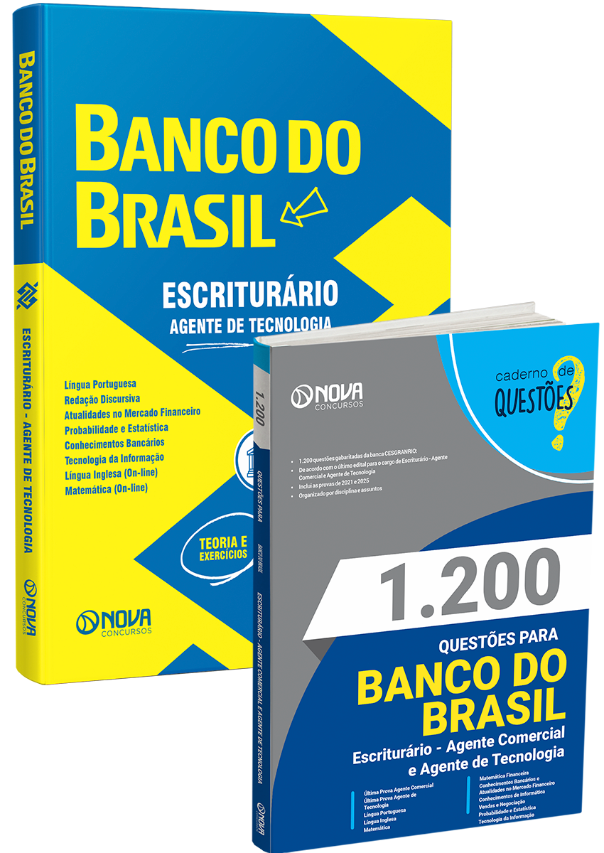 - Livro 1.200 Questões Gabaritadas para o Banco do Brasil 2026 - Escriturário - Agente Comercial e Agente de Tecnologia: inclui questões de concursos recentes da banca Cesgranrio, organizadora responsável pelo certame do concurso do Banco do Brasil, selecionadas de acordo com os principais assuntos cobrados no ultimo edital, para os cargos de Escriturário - Agente Comercial e Agente de Tecnologia.