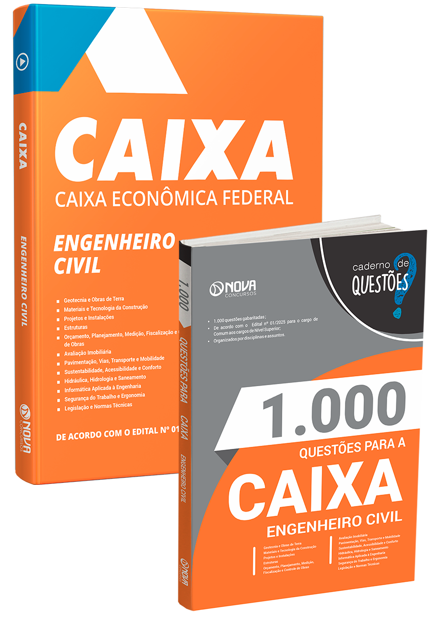 - Livro 1000 Questões Gabaritadas para CAIXA - Engenheiro Civil: inclui questões de concursos recentes da banca Fundação Cesgranrio, organizadora responsável pelo certame do concurso da Caixa Econômica Federal, selecionadas de acordo com os principais assuntos cobrados no edital para o cargo de Engenheiro Civil.