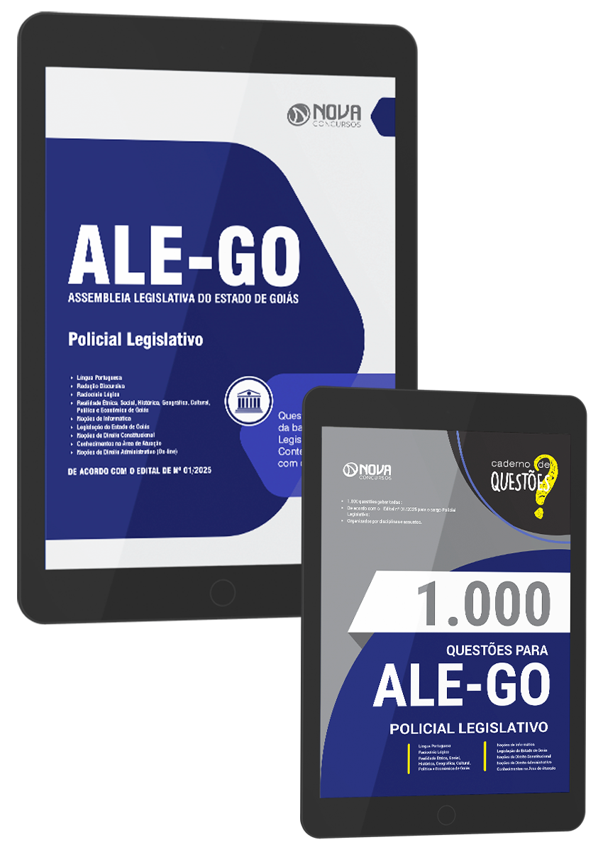- Livro 1000 Questões Gabaritadas para ALEGO - Policial Legislativo: inclui questões de concursos recentes da banca FGV, organizadora responsável pelo certame do concurso da Assembleia Legislativa do Estado de Goiás, selecionadas de acordo com os principais assuntos cobrados no edital, para o cargo Policial Legislativo.