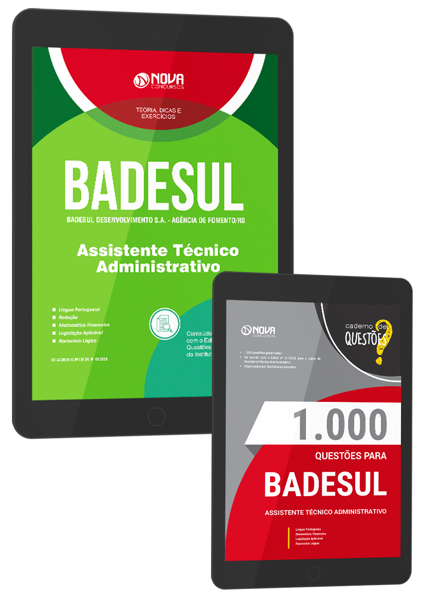 - Livro 1000 Questões Gabaritadas para BADESUL - Assistente Técnico Administrativo: inclui questões de concursos recentes da banca Instituto Legalle, organizadora responsável pelo certame do concurso do BADESUL - Agência de Fomento do Estado do Rio Grande do Sul-RS, selecionadas de acordo com os principais assuntos cobrados no edital, para o cargo Assistente Técnico Administrativo.