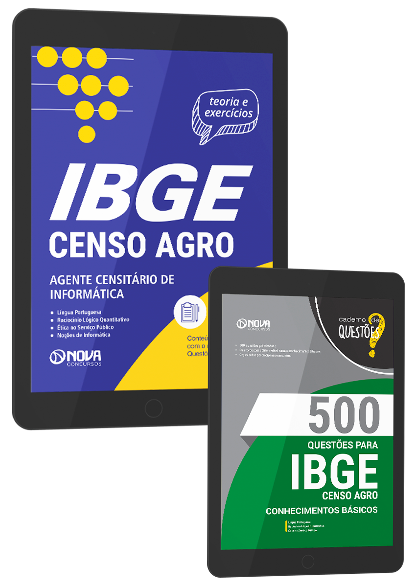 - Livro 500 Questões Gabaritadas para IBGE Temporário 2026 - Censo Agro - Conhecimentos Gerais: inclui questões de concursos recentes, organizadora responsável pelo certame do concurso do IBGE Temporário 2026 - Censo Agro, selecionadas de acordo com os principais assuntos cobrados no ultimo edital.