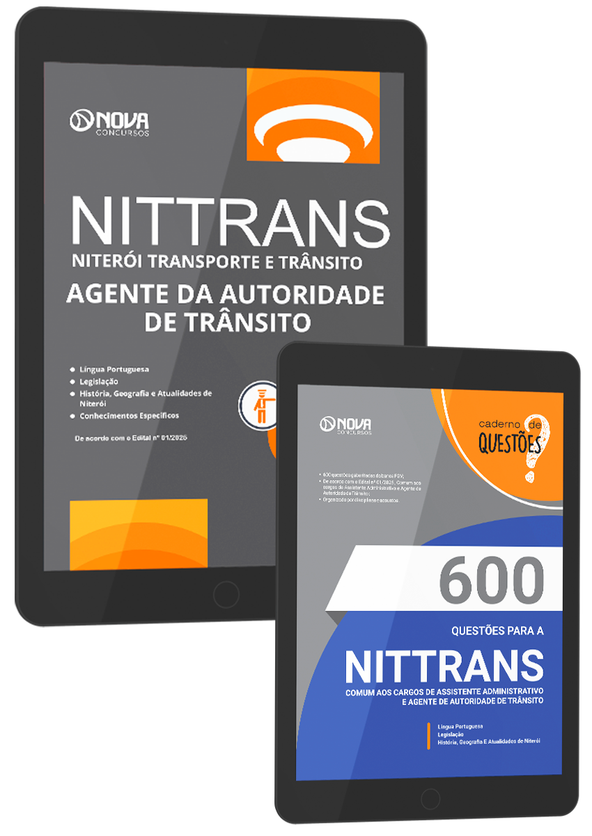 - Livro 600 Questões Gabaritadas NITTRANS - Comum aos Cargos de Assistente Administrativo e Agente de Autoridade de Trânsito: inclui questões de concursos recentes da banca , organizadora responsável pelo certame do concurso NITTRANS - Niterói Transporte e Trânsito, selecionadas de acordo com os principais assuntos cobrados no EDITAL Nº 01/2025, DE 19 DE JULHO DE 2025, em Comum aos Cargos de Assistente Administrativo e Agente de Autoridade de Trânsito.
