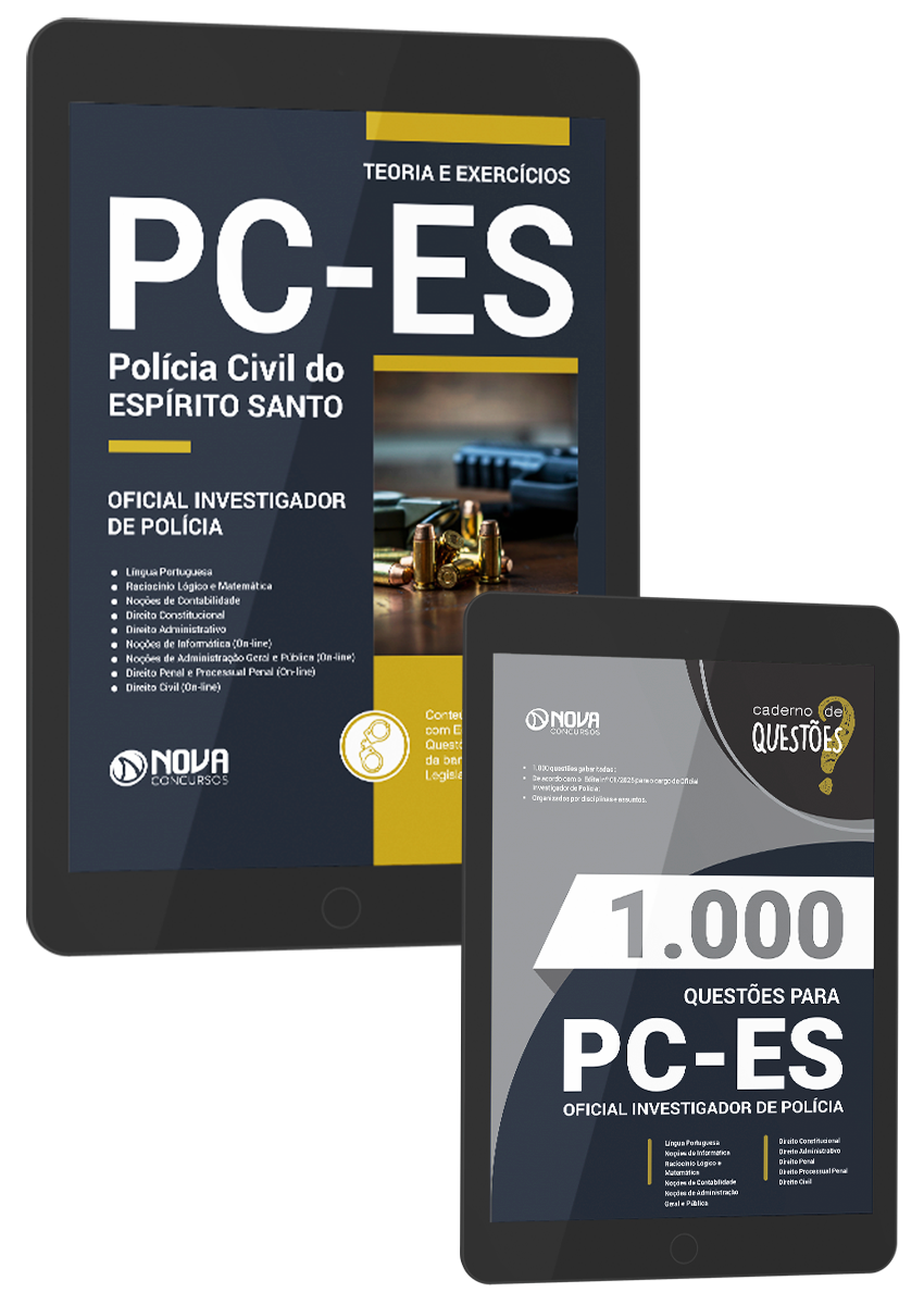 - Apostila PC-ES 2025 - Oficial Investigador de Polícia: 100% atualizada e totalmente otimizada para agilizar seus estudos, de acordo com o Edital 01/2025. O material foi elaborado por nosso time de professores especialistas em concursos e organizado para proporcionar uma fácil assimilação do conteúdo.