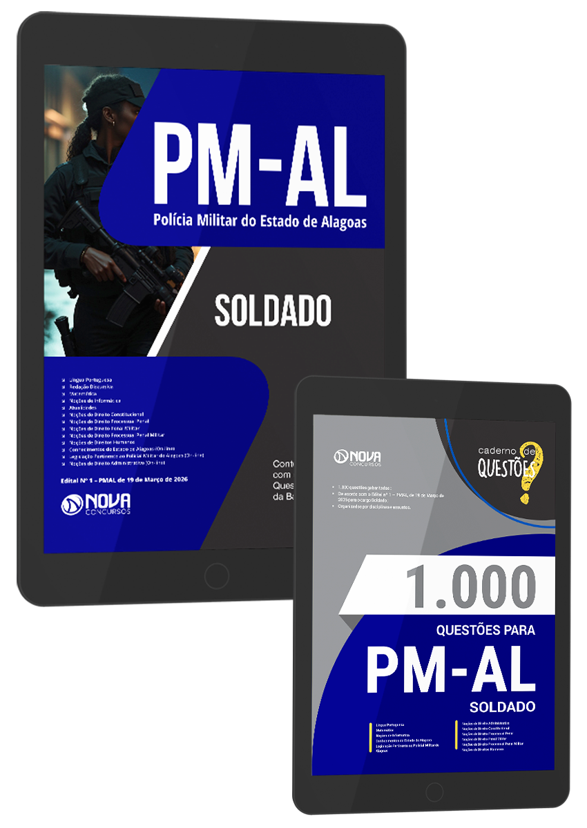 - Apostila PM-AL 2026 - Soldado: 100% atualizada e totalmente otimizada para agilizar seus estudos, de acordo com o Edital 1/2026. O material foi elaborado por nosso time de professores especialistas em concursos e organizado para proporcionar uma fácil assimilação do conteúdo.