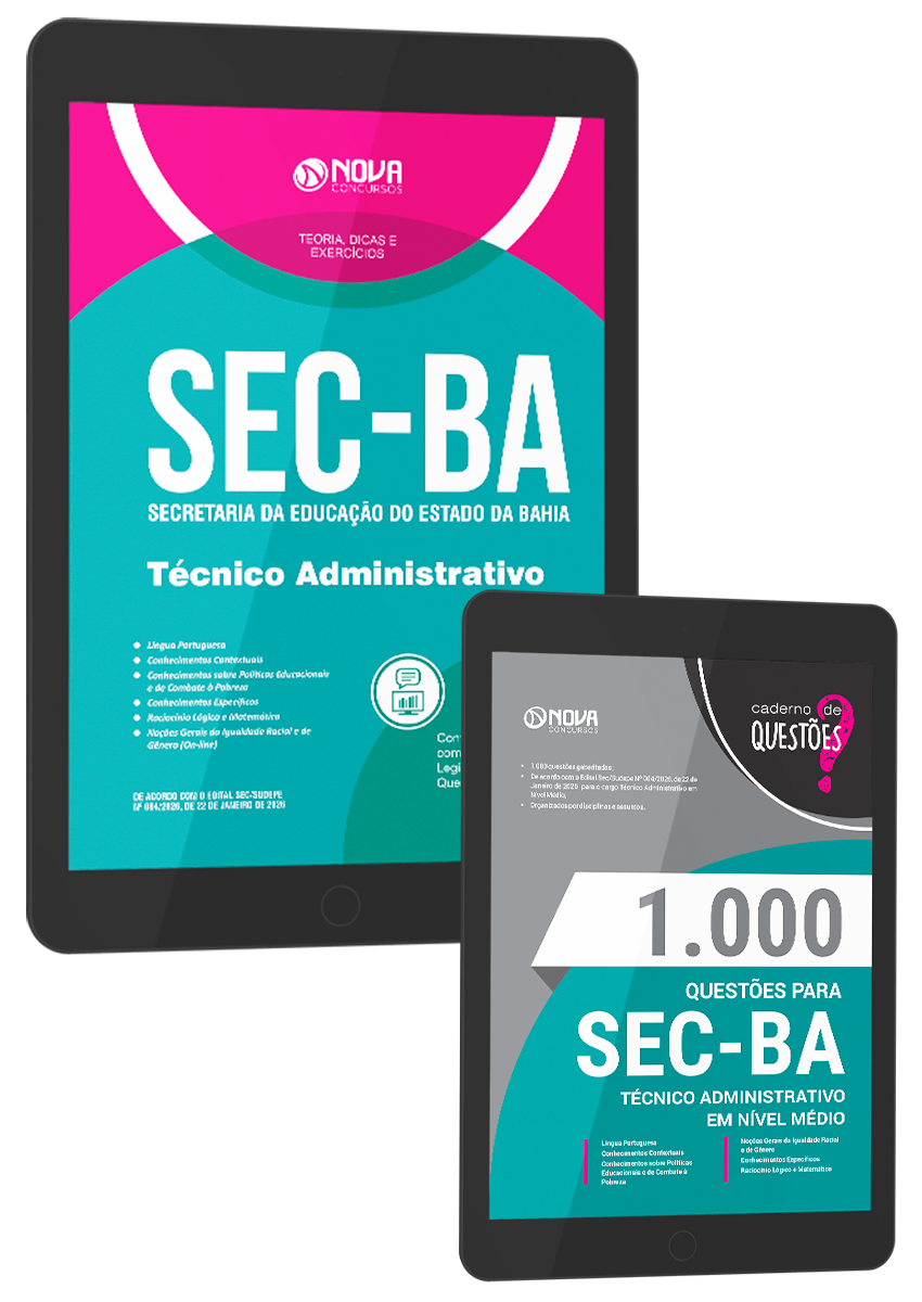- Livro 1000 Questões Gabaritadas para SEC-BA - Técnico Administrativo em Nível Médio: inclui questões de concursos recentes da banca IBFC, organizadora responsável pelo certame do concurso da Secretaria de Educação do Estado da Bahia, selecionadas de acordo com os principais assuntos cobrados no edital, para o cargo Técnico Administrativo em Nível Médio.