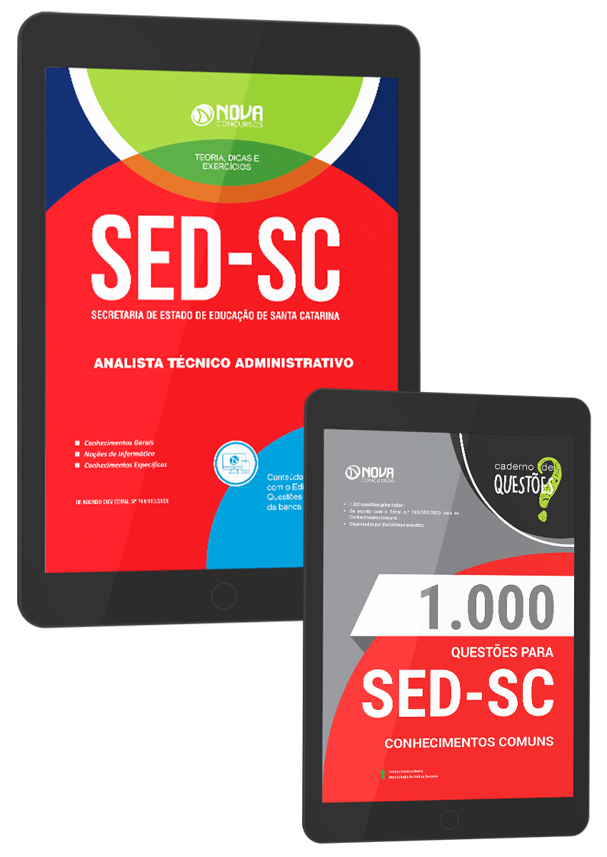 - Livro 1000 Questões Gabaritadas para SED-SC - Conhecimentos Comuns: inclui questões de concursos recentes da banca , organizadora responsável pelo certame do concurso da Secretaria de Estado da Educação de Santa Catarina, selecionadas de acordo com os principais assuntos cobrados no edital.