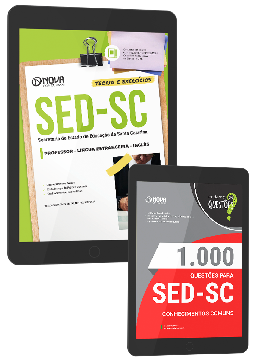 - Livro 1000 Questões Gabaritadas para SED-SC - Conhecimentos Comuns: inclui questões de concursos recentes da banca , organizadora responsável pelo certame do concurso da Secretaria de Estado da Educação de Santa Catarina, selecionadas de acordo com os principais assuntos cobrados no edital.