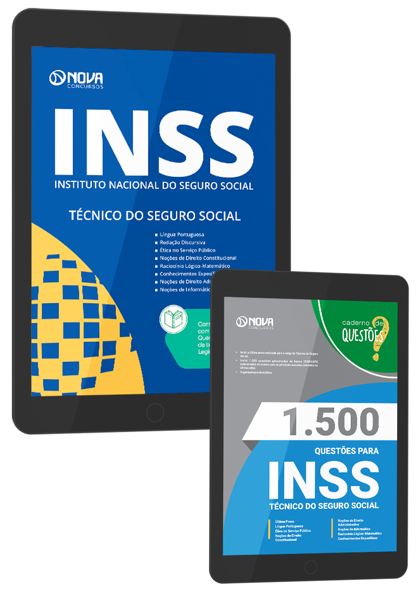 - Livro 1.500 Questões Gabaritadas para INSS - Técnico do Seguro Social: inclui questões de concursos recentes da banca CEBRASPE, organizadora responsável pelo certame do concurso do Instituto Nacional do Seguro Social, selecionadas de acordo com os principais assuntos cobrados no ultimo edital, para o cargo Técnico do Seguro Social.