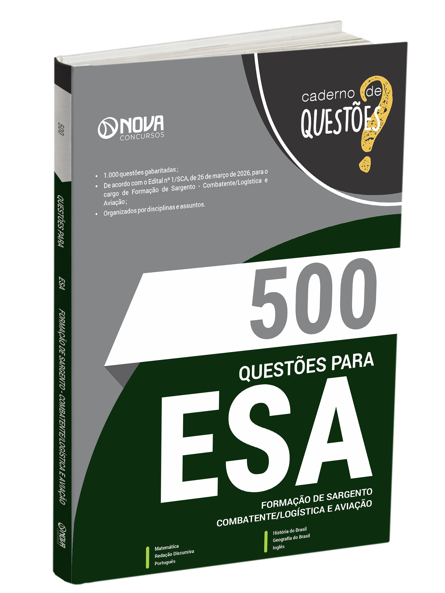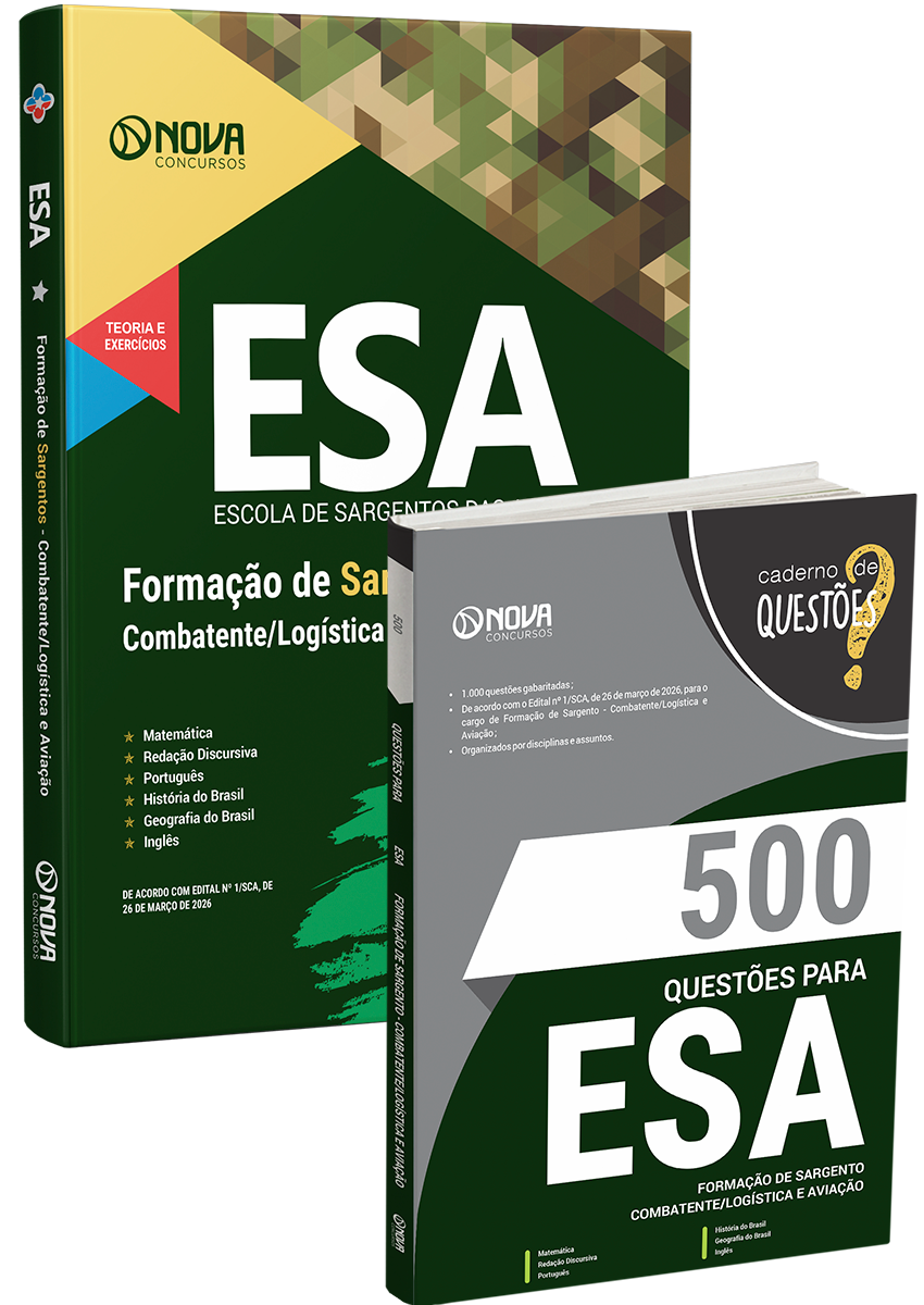 - Livro 500 Questões Gabaritadas para ESA - Curso de Formação de Sargento - Área: Combatente/Logística e Aviação: inclui questões de concursos recentes da banca, organizadora responsável pelo certame do concurso da Escola de Sargentos das Armas, selecionadas de acordo com os principais assuntos cobrados no edital, para o Curso de Formação de Sargento - Área: Combatente/Logística e Aviação.