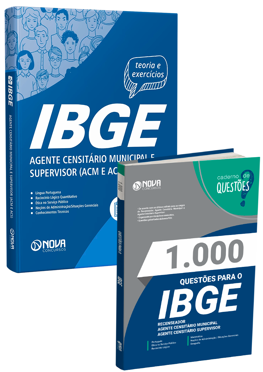 - Livro 1.000 Questões Gabaritadas para o IBGE - Recenseador, Agente Censitário Municipal e Agente Censitário Supervisor: inclui questões de concursos recentes da banca, organizadora responsável pelo certame do concurso do Instituto Brasileiro de Geografia e Estatística, selecionadas de acordo com os principais assuntos cobrados no ultimo edital, para os cargos de Agente Censitário Municipal (ACM) e Agente Censitário Supervisor (ACS).
