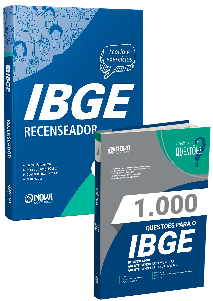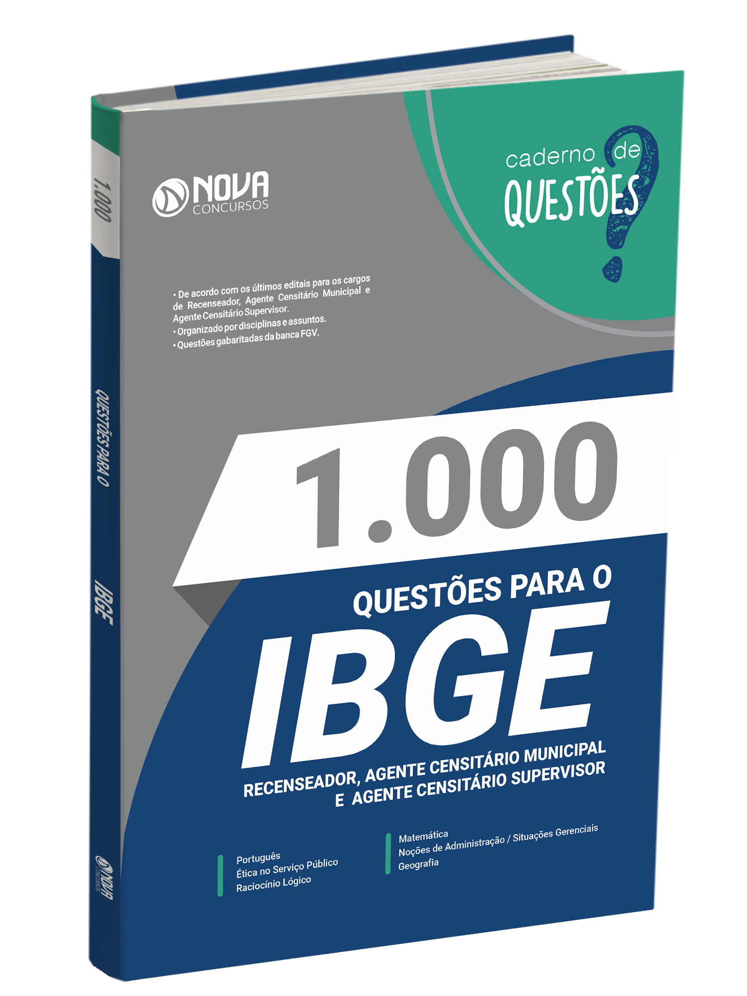 - Livro 1.000 Questões Gabaritadas para o IBGE - Recenseador, Agente Censitário Municipal e Agente Censitário Supervisor: inclui questões de concursos recentes da banca, organizadora responsável pelo certame do concurso do Instituto Brasileiro de Geografia e Estatística, selecionadas de acordo com os principais assuntos cobrados no ultimo edital, para os cargos de Recenseador, Agente Censitário Municipal (ACM) e Agente Censitário Supervisor (ACS).