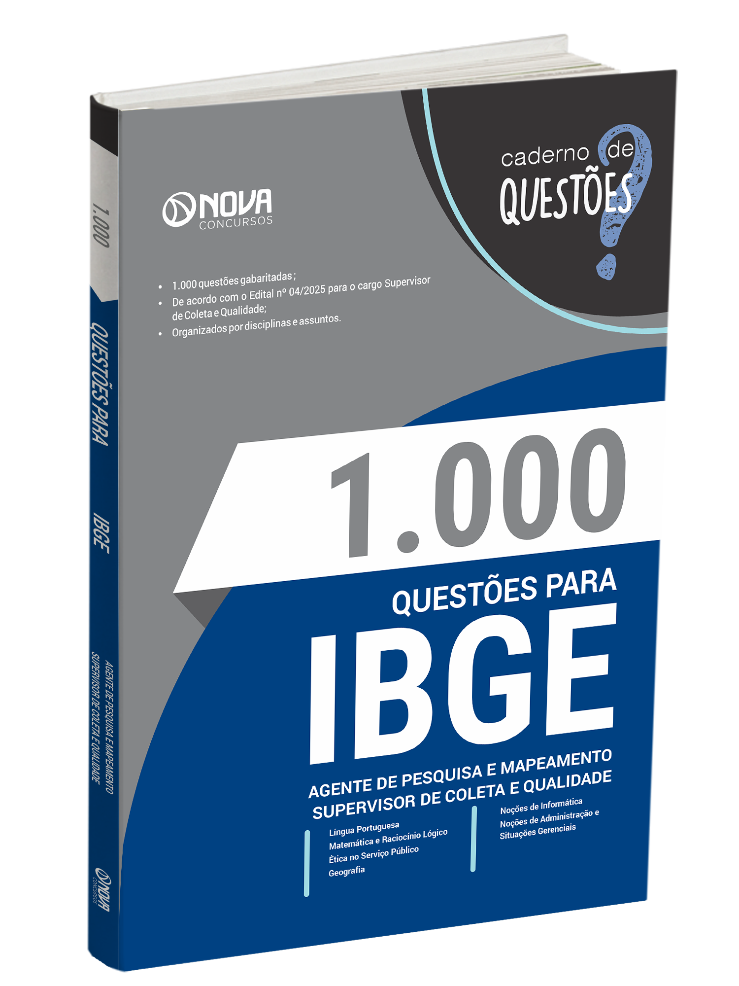 - Livro 1000 Questões Gabaritadas para IBGE - Agente de Pesquisas e Mapeamento (APM) e Supervisor de Coleta e Qualidade (SCQ): inclui questões de concursos recentes da banca FGV, organizadora responsável pelo certame do concurso do Instituto Brasileiro de Geografia e Estatística, selecionadas de acordo com os principais assuntos cobrados no ultimo edital, para os cargos Agente de Pesquisas e Mapeamento (APM) e Supervisor de Coleta e Qualidade (SCQ).