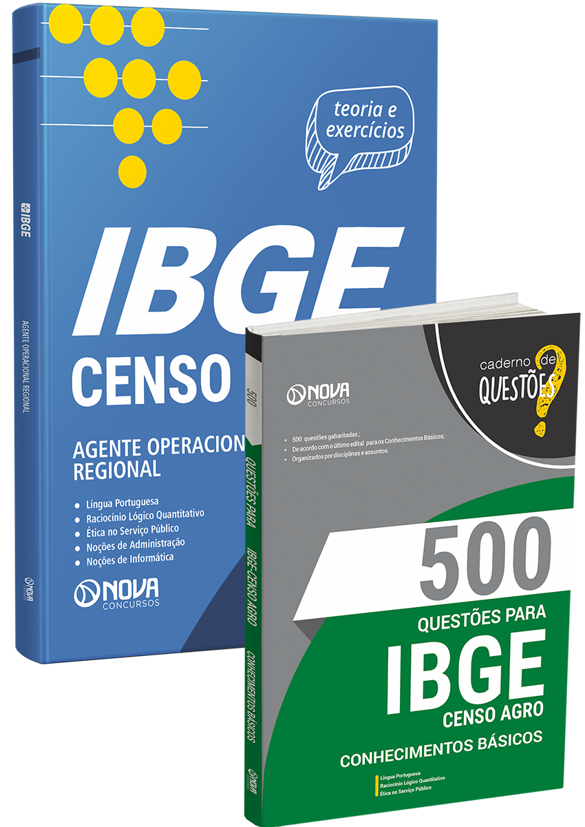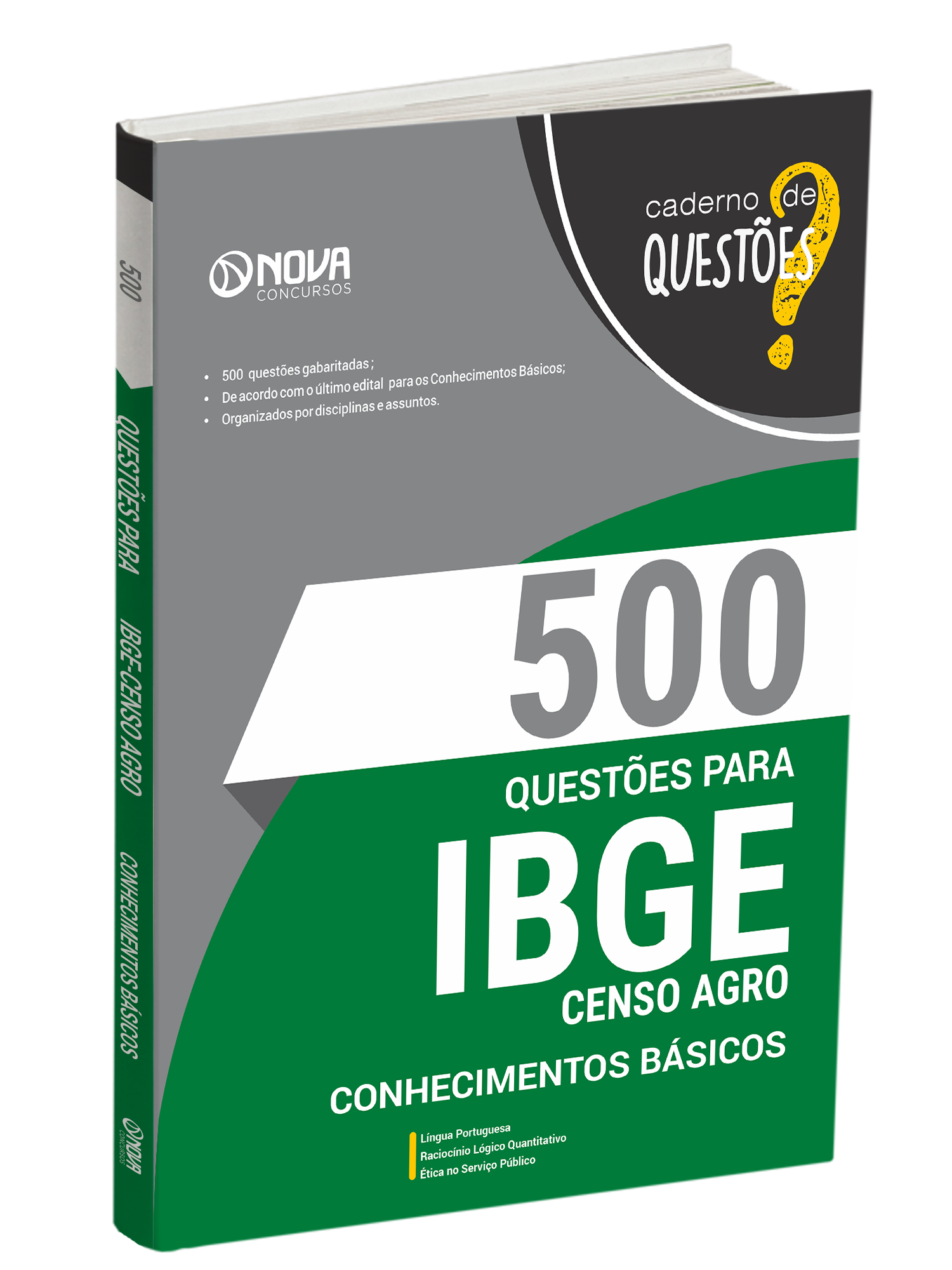 - Livro 500 Questões Gabaritadas para IBGE Temporário 2026 - Censo Agro - Conhecimentos Gerais: inclui questões de concursos recentes, organizadora responsável pelo certame do concurso do IBGE Temporário 2026 - Censo Agro, selecionadas de acordo com os principais assuntos cobrados no ultimo edital.