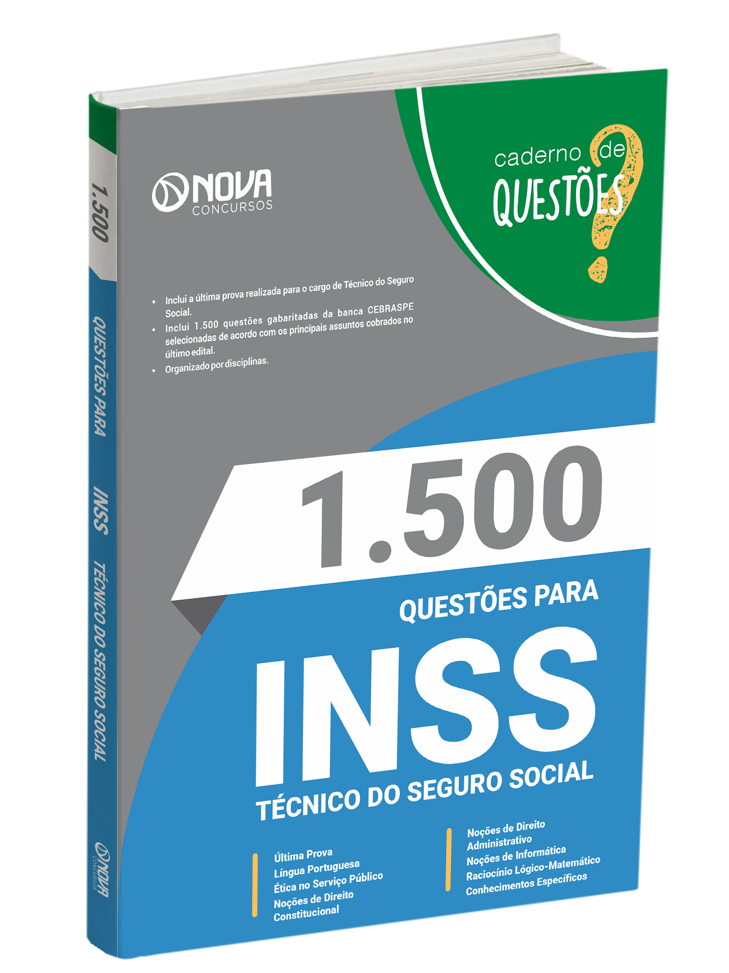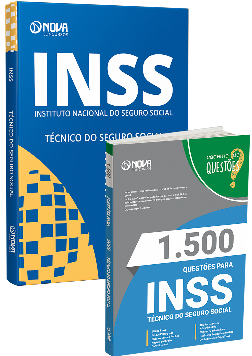 - Livro 1.500 Questões Gabaritadas para INSS - Técnico do Seguro Social: inclui questões de concursos recentes da banca CEBRASPE, organizadora responsável pelo certame do concurso do Instituto Nacional do Seguro Social, selecionadas de acordo com os principais assuntos cobrados no ultimo edital, para o cargo Técnico do Seguro Social.