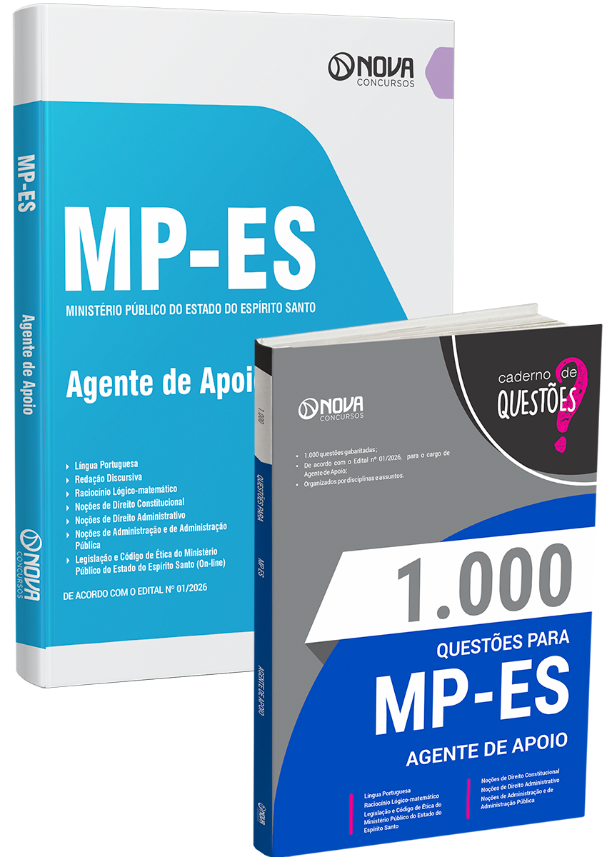 - Livro 1000 Questões Gabaritadas para MP-ES - Agente de Apoio: inclui questões de concursos recentes da banca organizadora responsável pelo certame do concurso do Ministério Público do Espírito Santo, selecionadas de acordo com os principais assuntos cobrados no ultimo edital, para o cargo de Agente de Apoio - Administrativa.