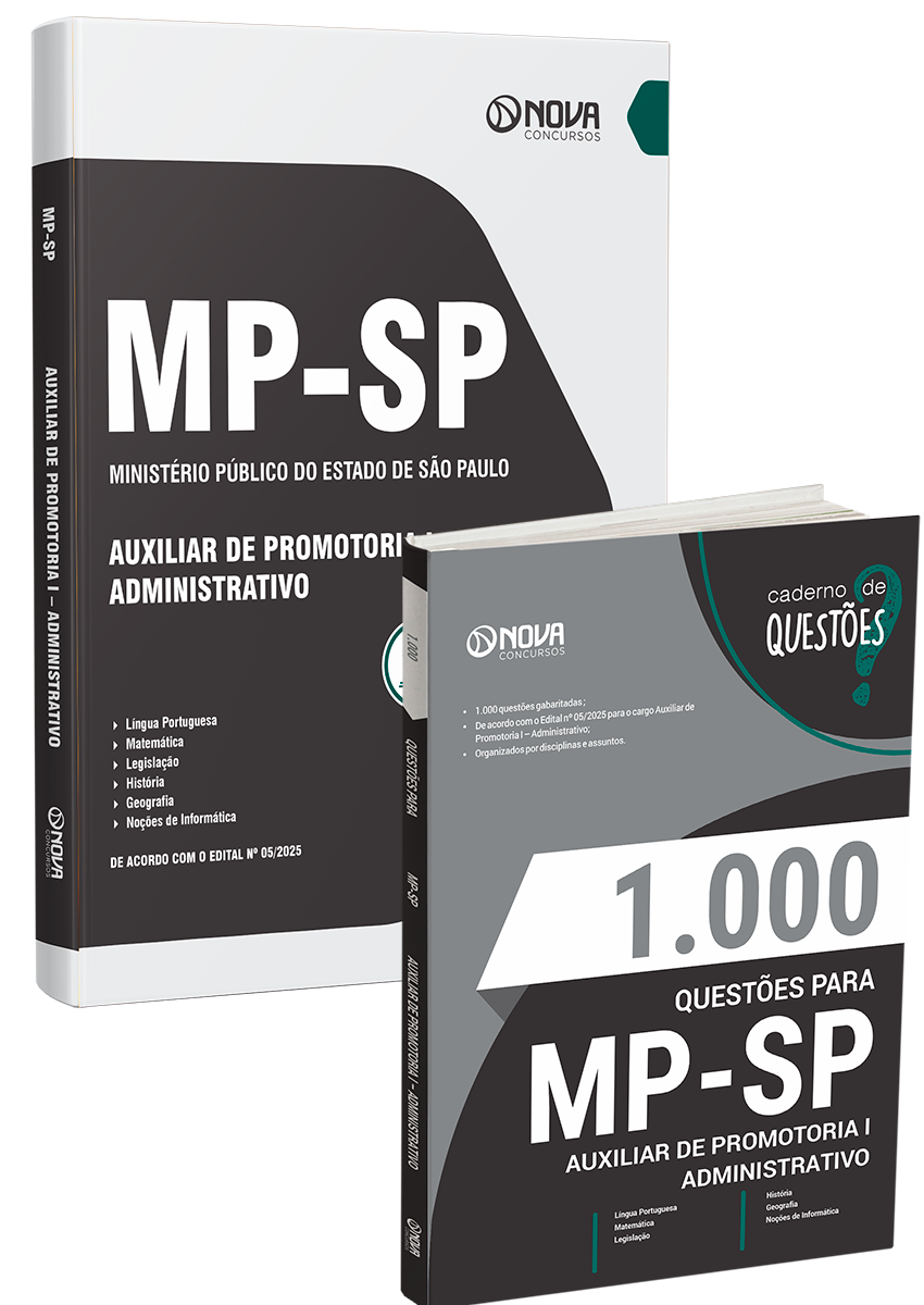 - Apostila MP-SP 2026 - Auxiliar de Promotoria I - Administrativo: 100% atualizada e totalmente otimizada para agilizar seus estudos, de acordo com o Edital nº 05/2025. O material foi elaborado por nosso time de professores especialistas em concursos e organizado para proporcionar uma fácil assimilação do conteúdo.