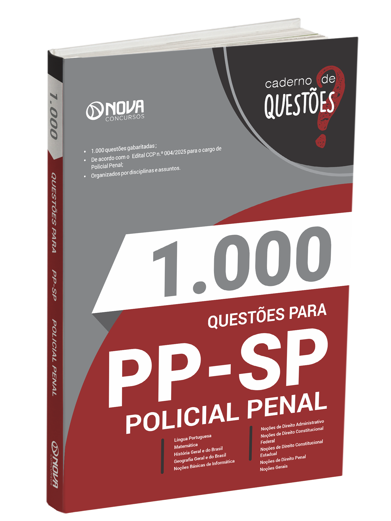 - Livro 1.000 Questões Gabaritadas para a Polícia Penal-SP - Policial Penal: inclui questões de concursos recentes da banca, organizadora responsável pelo certame do concurso da Polícia Penal de São Paulo, selecionadas de acordo com os principais assuntos cobrados no ultimo edital, para o cargo de Policial Penal.