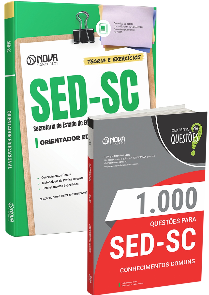 - Livro 1000 Questões Gabaritadas para SED-SC - Conhecimentos Comuns: inclui questões de concursos recentes da banca , organizadora responsável pelo certame do concurso da Secretaria de Estado da Educação de Santa Catarina, selecionadas de acordo com os principais assuntos cobrados no edital.