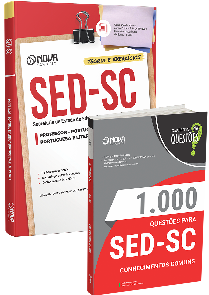 - Livro 1000 Questões Gabaritadas para SED-SC - Conhecimentos Comuns: inclui questões de concursos recentes da banca , organizadora responsável pelo certame do concurso da Secretaria de Estado da Educação de Santa Catarina, selecionadas de acordo com os principais assuntos cobrados no edital.