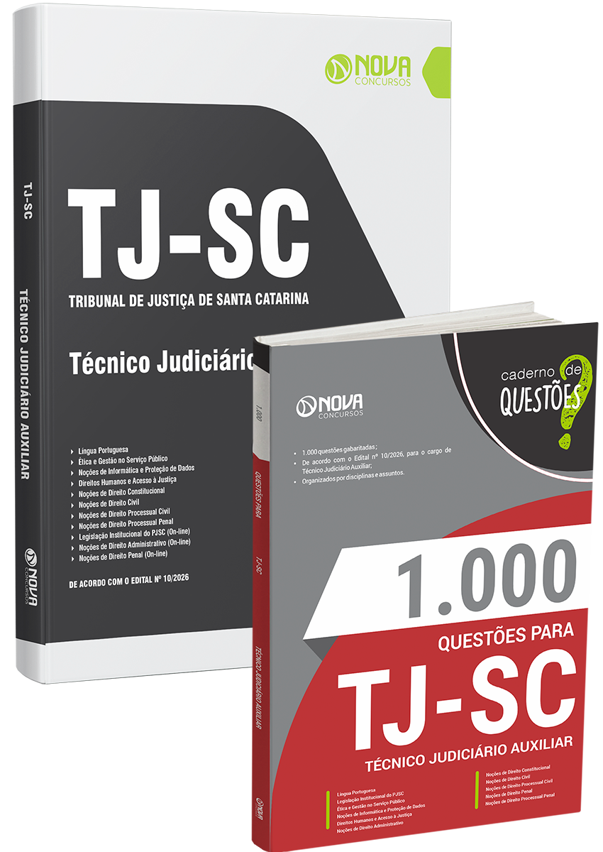 - Apostila TJ-SC 2026 - Técnico Judiciário Auxiliar: 100% atualizada e totalmente otimizada para agilizar seus estudos, de acordo com o último Edital. O material foi elaborado por nosso time de professores especialistas em concursos e organizado para proporcionar uma fácil assimilação do conteúdo.