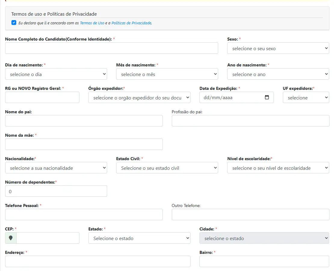 Depois do acesso, o sistema direcionará o candidato para a página de inscrição, onde será necessário preencher o formulário com os dados pessoais completos, conforme mostrado abaixo.