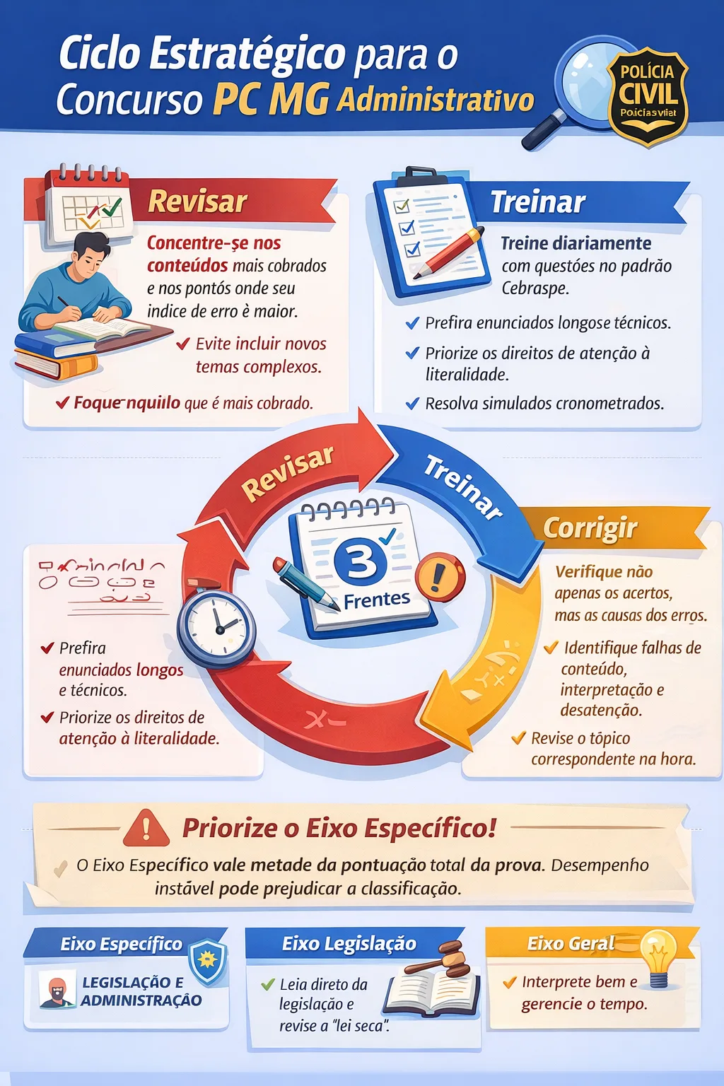 Na fase decisiva do concurso PC MG Administrativo, a preparação deve seguir um ciclo estratégico baseado em três frentes: revisar, treinar e corrigir. A revisão precisa ser direcionada aos conteúdos mais cobrados e aos pontos em que o candidato apresenta maior índice de erro, evitando a inclusão de novos temas complexos a poucas semanas da prova. Veja: