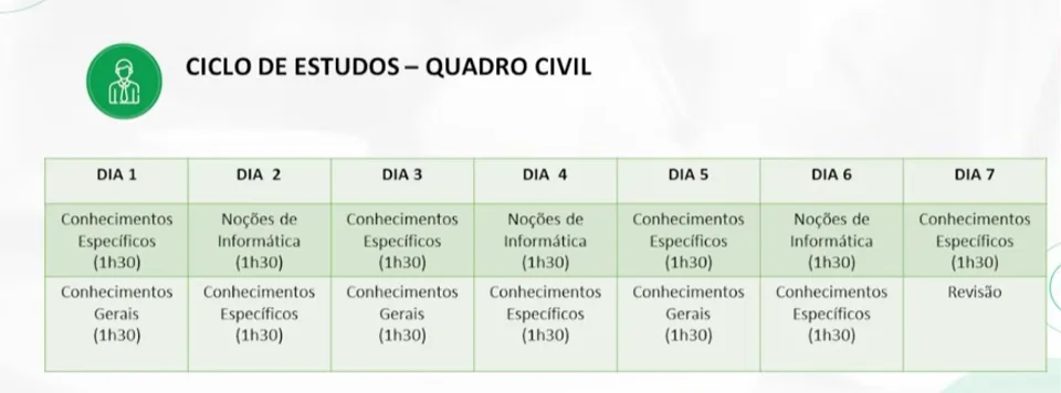 Para os cargos do quadro civil, o ideal é priorizar os conhecimentos específicos, já que eles correspondem a cerca de 60% da prova objetiva. O ciclo de estudos deve alternar blocos de disciplinas, como conhecimentos específicos, conhecimentos gerais e noções de informática, com sessões médias de 1h30 cada. Além disso, é fundamental reservar um momento na semana apenas para revisão, consolidando tudo o que foi estudado nos dias anteriores e reforçando os pontos com maior dificuldade. Confira: