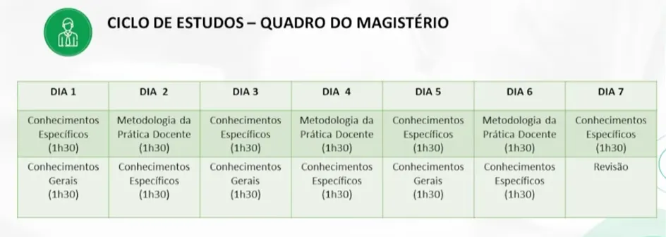 No caso do quadro do magistério, a lógica do ciclo de estudos é semelhante, mas com a inclusão da disciplina de Metodologia da Prática Docente, que deve aparecer de forma intercalada com conhecimentos gerais e específicos ao longo da semana. Veja: