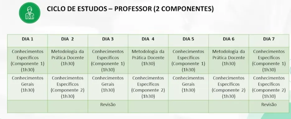 Já para o cargo de professor, especialmente quando há atuação em dois componentes curriculares, é importante dividir o tempo entre as duas áreas específicas, mantendo equilíbrio entre elas. Nesses casos, pode ser necessário ampliar a carga de estudos diária para dar conta de todos os conteúdos, sempre mantendo revisões periódicas como parte essencial da preparação. Veja na tabela abaixo: