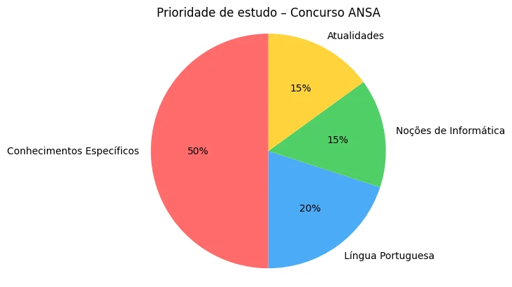 Veja, no gráfico abaixo, a distribuição das disciplinas cobradas na prova objetiva do concurso ANSA. A visualização ajuda a identificar quais conteúdos possuem maior peso no exame e, portanto, devem receber mais atenção durante a preparação.