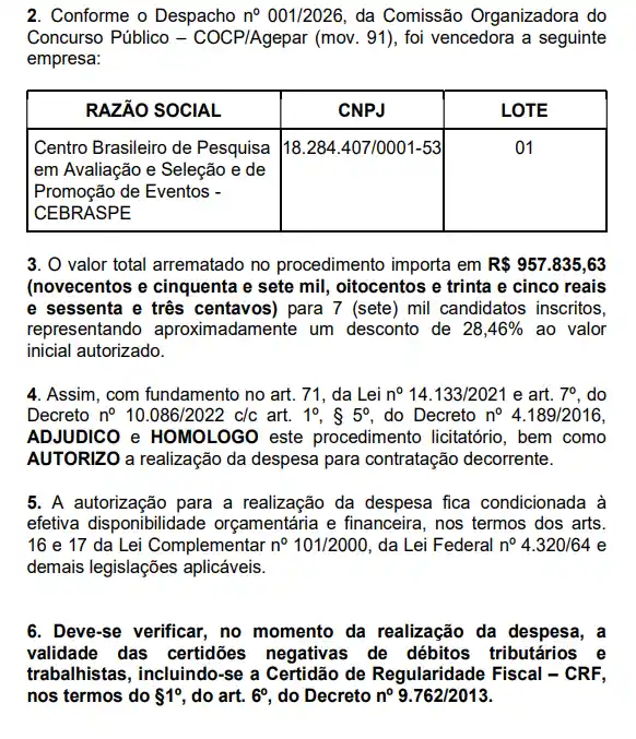 O concurso Agepar PR deve ter o edital publicado em breve. A novidade é que o certame já conta com banca organizadora oficialmente definida. O Cebraspe foi escolhido por meio de dispensa de licitação, conforme documento publicado na sexta-feira, 27 de fevereiro, no Diário Oficial do Estado do Paraná. Veja: