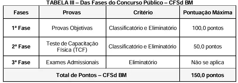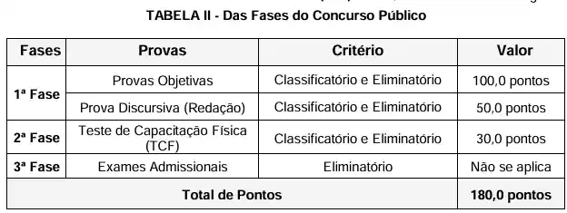 - 2ª fase: Teste de Capacitação Física (TCF), de caráter eliminatório e classificatório