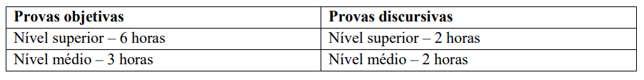Confira, também, na tabela a seguir, o tempo de duração das provas para os diferentes níveis de escolaridade:
