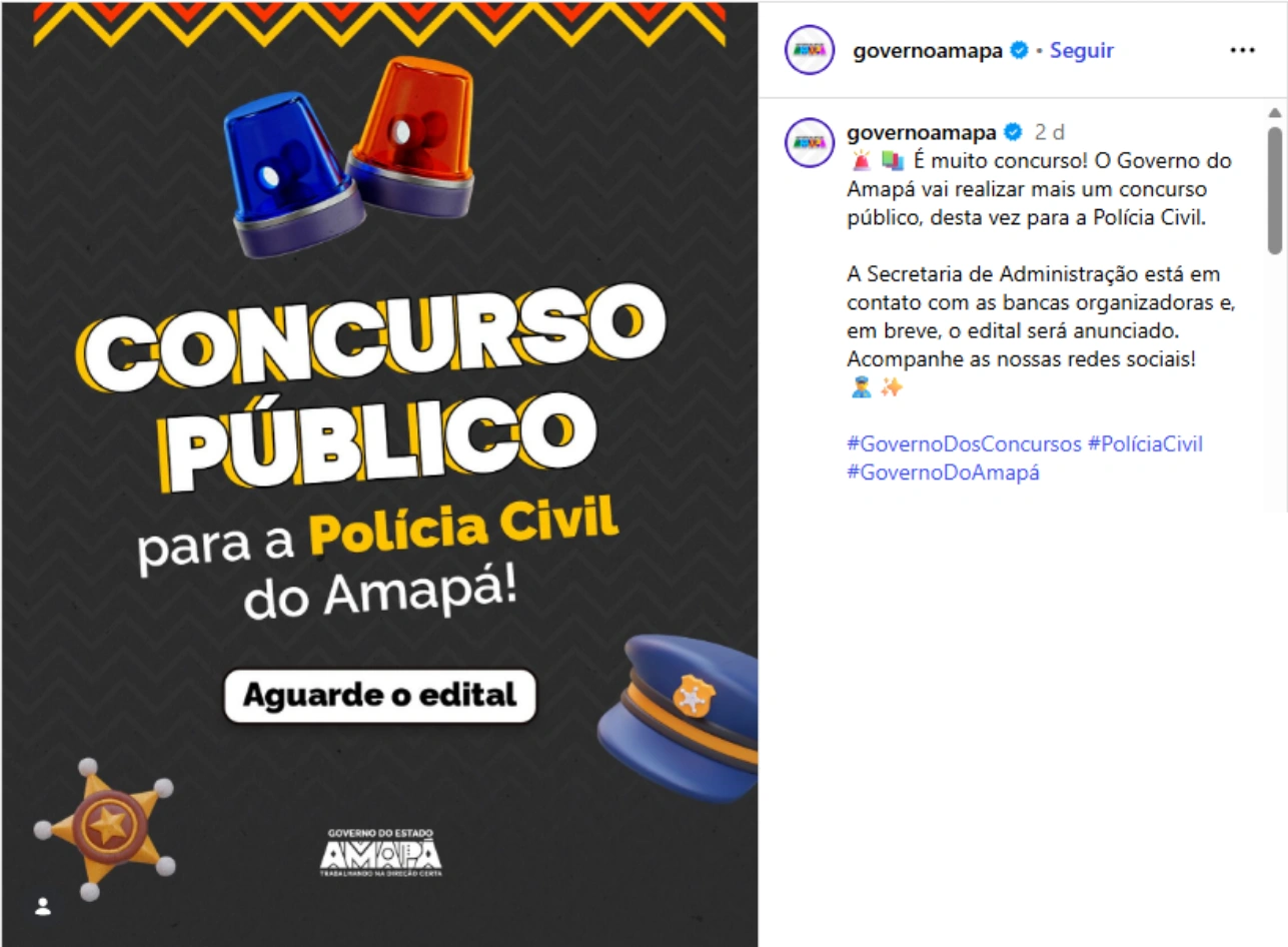 O concurso PC AP avançou em seus preparativos com a início do processo de escolha da banca organizadora! A informação foi divulgada nas redes sociais do governo do Estado, no dia 15 de março.