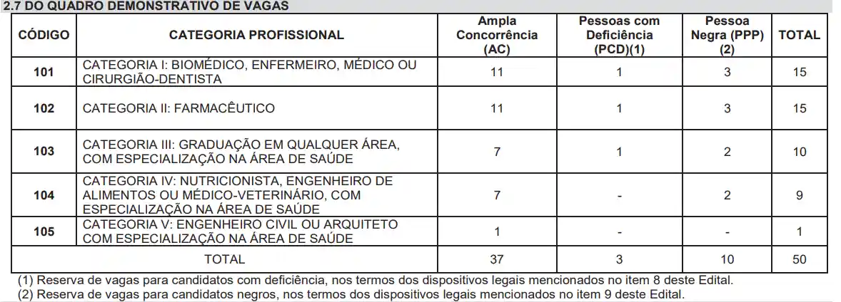 Segundo o documento, serão ofertadas 50 vagas de provimento imediato, além de cadastro reserva, para o cargo de Fiscal de Saúde Pública, de nível superior.