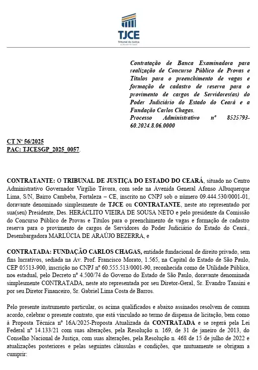O termo de referência do concurso TJ CE foi divulgado nesta segunda-feira, 6 de abril, no Portal Nacional de Contratações Públicas. O documento confirma a Fundação Carlos Chagas (FCC) como banca organizadora do novo concurso e apresenta informações detalhadas sobre os cargos previstos e as etapas da seleção. Confira na íntegra: