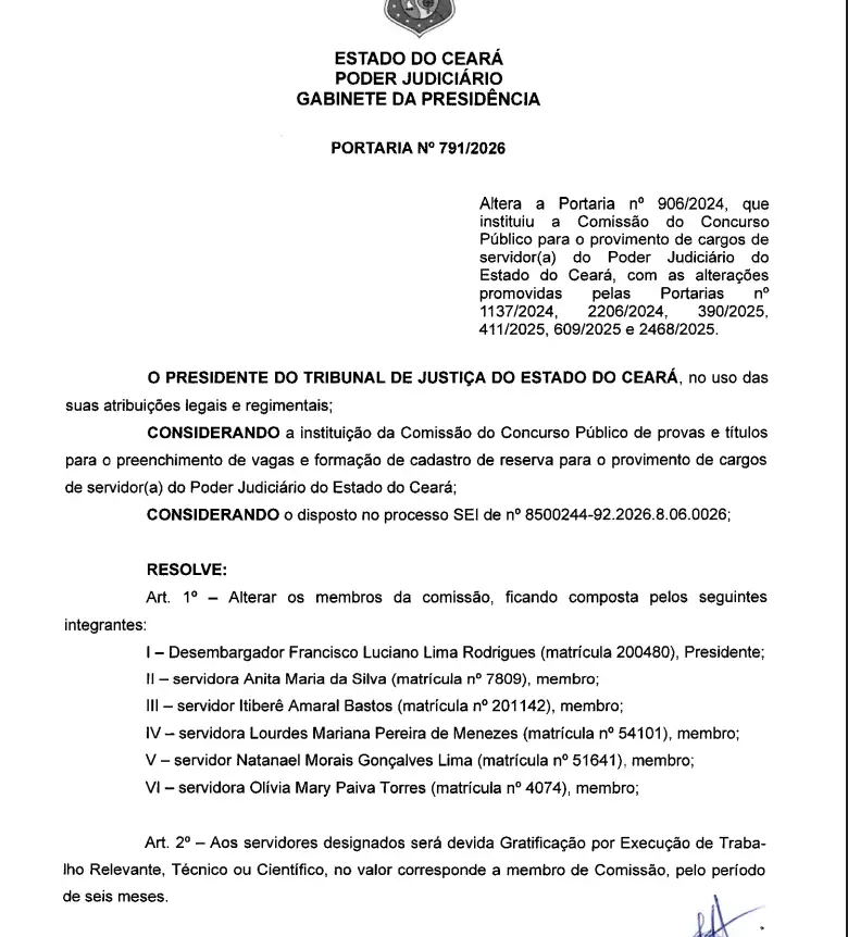 O concurso do TJ CE 2026 (Tribunal de Justiça do Estado do Ceará) agora conta com novos membros na comissão organizadora. A Portaria que instituiu o novo grupo foi publicada no Diário da Justiça nesta quarta-feira, dia 15 de abril. Veja: