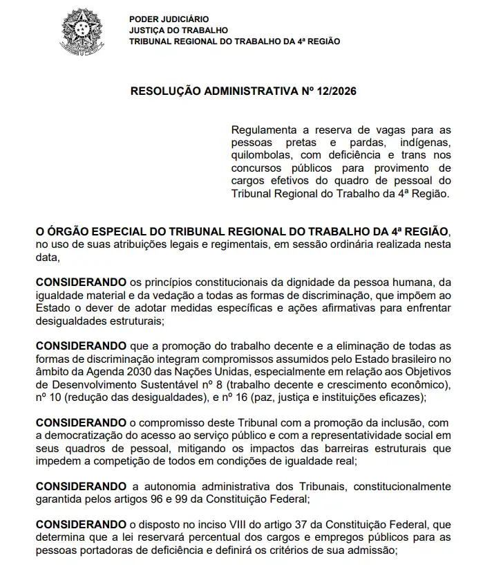 Na última quarta-feira, dia 15 de abril, foi publicada a Resolução Administrativa nº 12/2026, que regulamenta a política de reserva de vagas (cotas) nos concursos do Tribunal Regional do Trabalho da 4ª Região. A medida é considerada um avanço importante para a publicação do novo edital, já que a definição dessas regras era uma etapa necessária antes da abertura do certame. Confira o documento na íntegra: