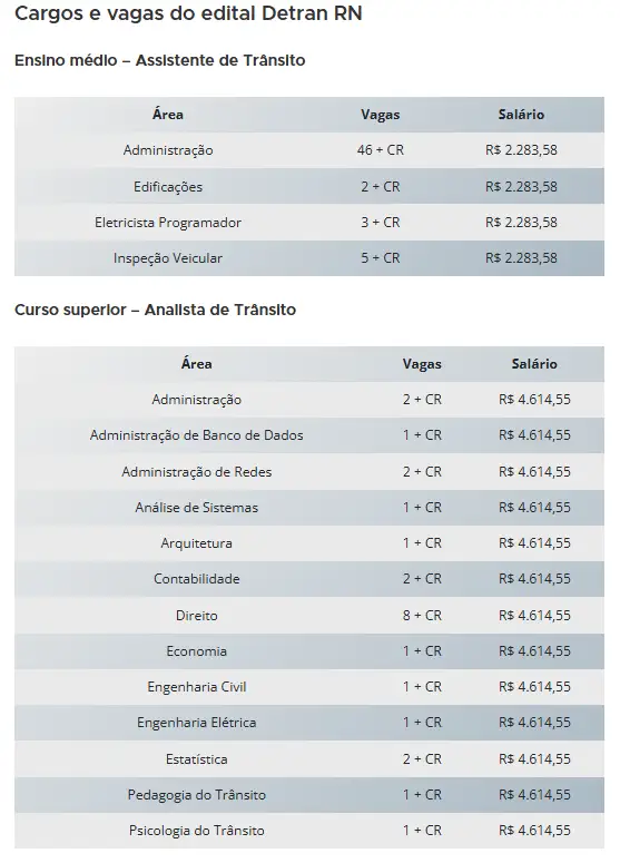 O último concurso Detran RN ocorreu em 2010 e ofertou 285 vagas imediatas para cargos de níveis médio, técnico e superior. Confira como essas oportunidades foram distribuídas: