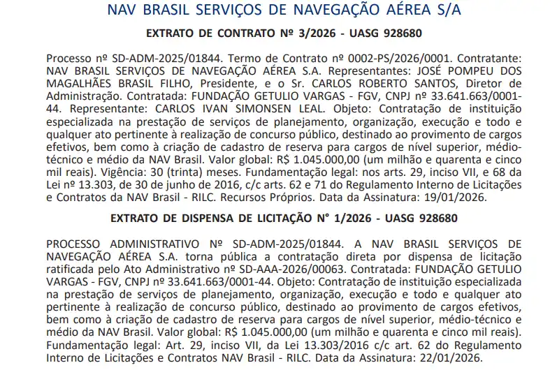 O concurso NAV Brasil pode ter o edital publicado ainda neste mês de abril segundo informações não oficiais. Além disso, a banca organizadora da seleção será a FGV que já foi contratada no dia 27 de janeiro de 2026. Confira o extrato de contrato na íntegra: