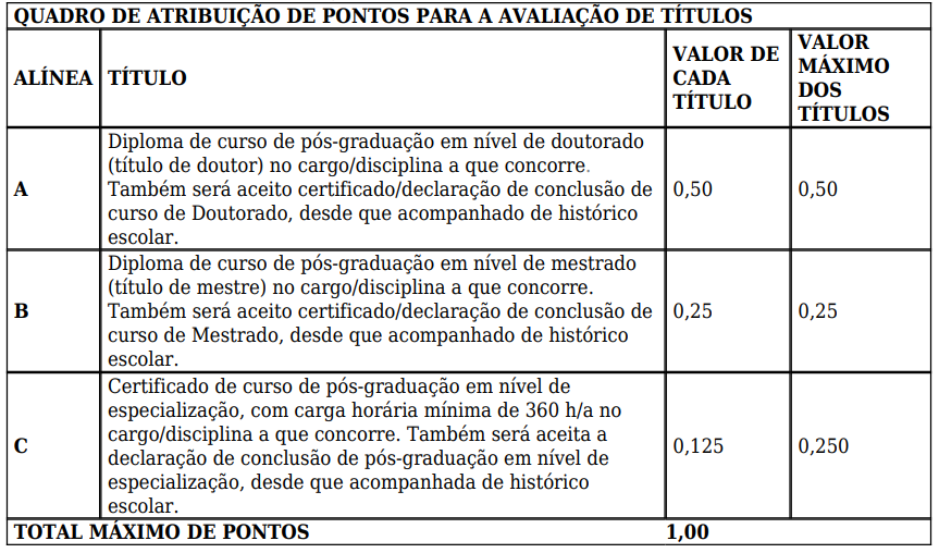 Na prova de títulos, foram considerados para pontuação cursos de doutorado, mestrado e pós-graduação lato sensu, com carga mínima de 360 horas.