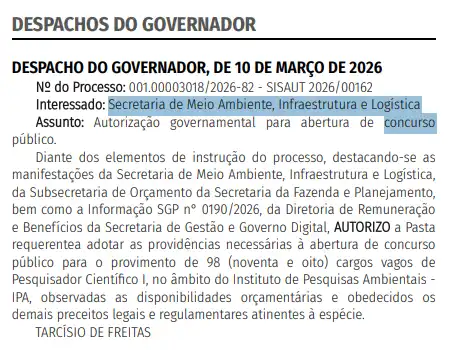 A principal novidade é que o governo estadual de São Paulo autorizou o edital para o concurso Secretaria do Meio Ambiente SP, com previsão de 98 oportunidades o cargo de Pesquisador Científico I. A seleção deverá reforçar o quadro de servidores responsáveis pela continuidade e o desenvolvimento das pesquisas ambientais.