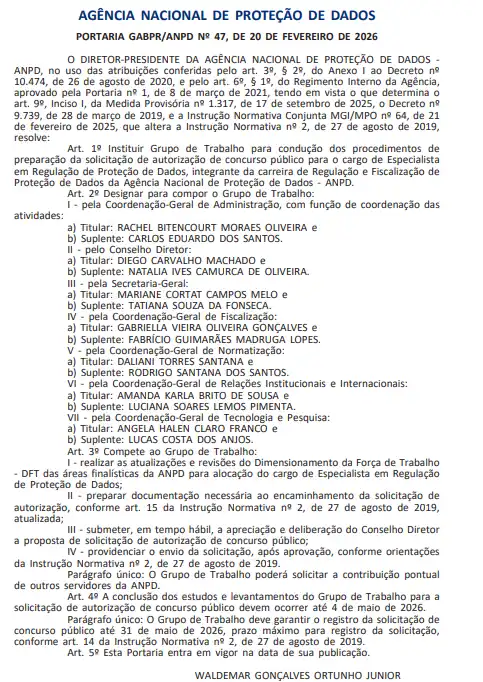 A portaria também prevê que o GT poderá convocar outros servidores da ANPD para prestar contribuições técnicas pontuais ao longo da execução dos trabalhos.