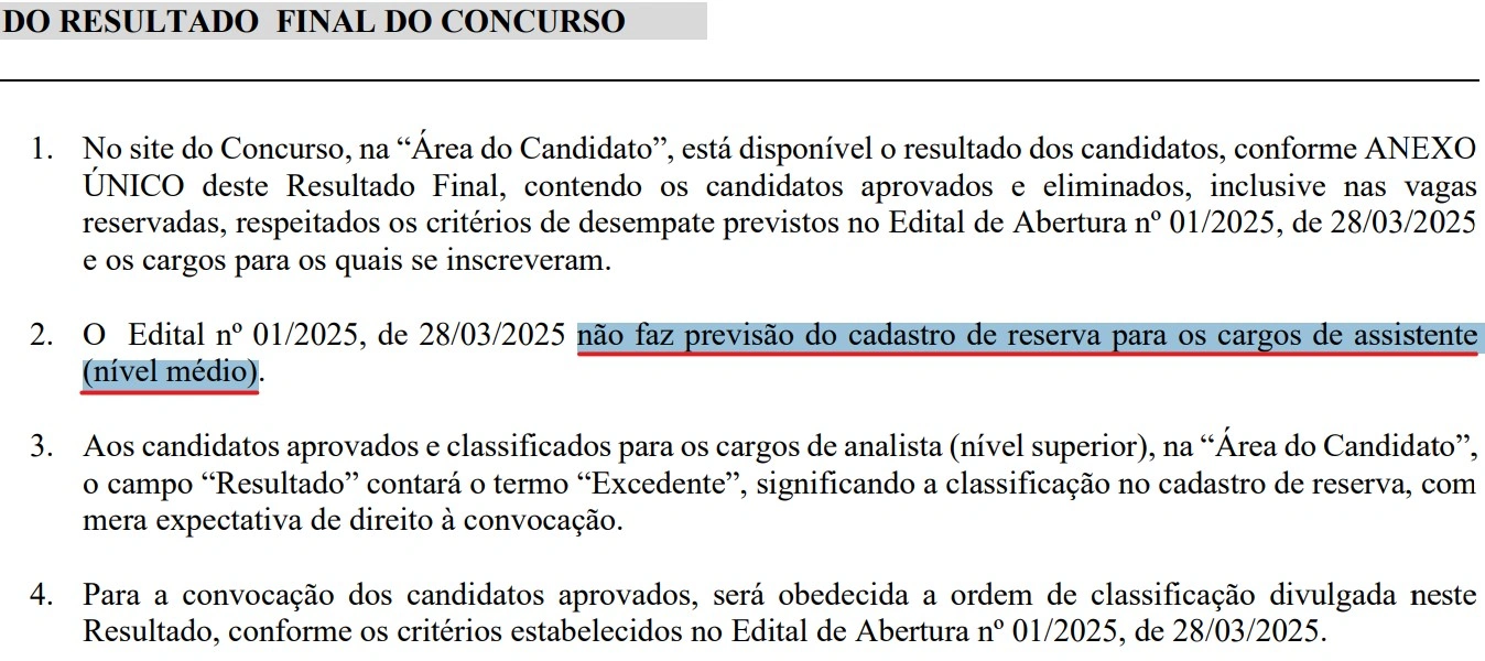 O Edital nº 001/2025 indicava expressamente o “provimento de vagas e formação de cadastro de reserva” para o cargo, sem qualquer ressalva ou menção à inexistência de CR. No entanto, essa informação não foi mantida no resultado final, o que gerou surpresa e insatisfação entre os candidatos afetados.